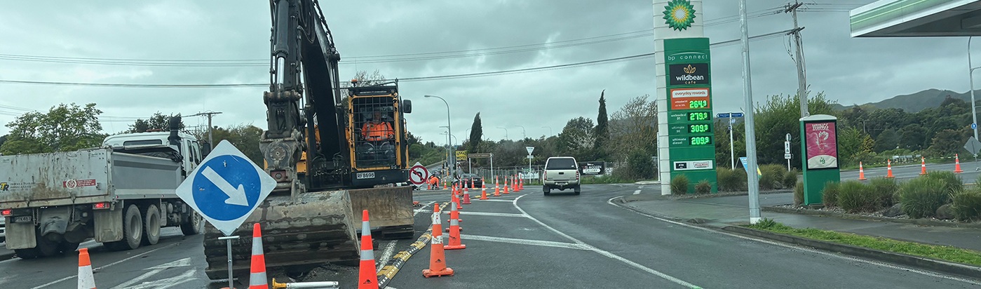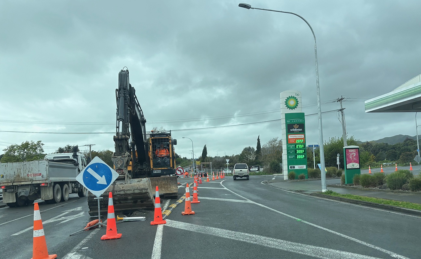 Meantime, the Mill Road crew has been working on the BP roundabout, levelling it off and laying pipes. Traffic along Old State Highway 1 has been funnelled into a lane each way to allow work on the western side of the roundabout. It will soon shift to the eastern side.